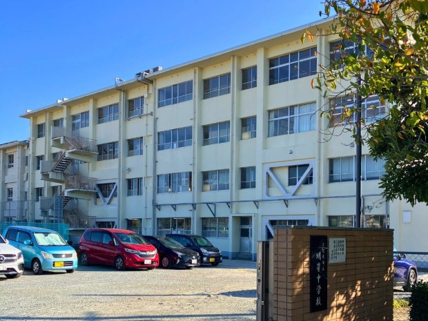分譲地北側の道路に位置する中学校です。(2025年10月撮影)
