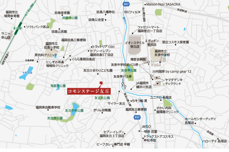 福岡市地下鉄七隈線「茶山」駅 徒歩16分 バス 西鉄バス 友泉亭 徒歩4分 |