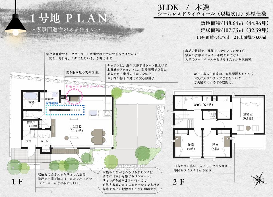 1号地の土地広さは44.96坪、建物は32.59坪の3LDKの住まいです。