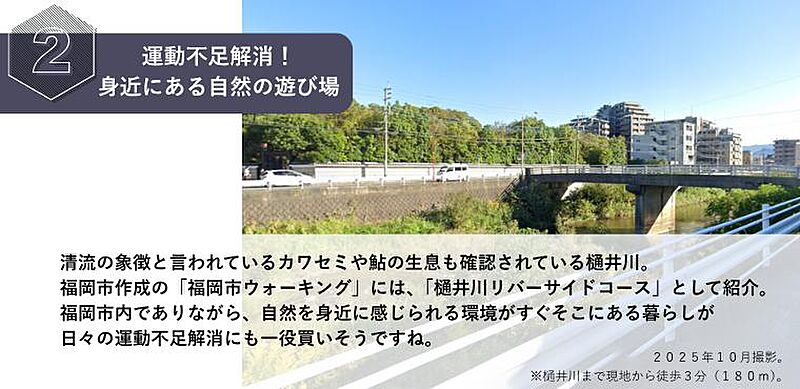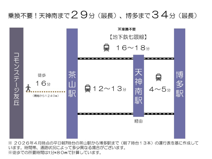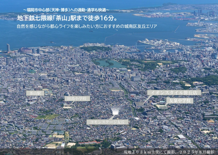 地下鉄七隈線「茶山」駅まで徒歩16分。「茶山」駅から「天神南」駅「博多」駅まで乗り換えなし。丘陵地帯を含む閑静な住宅街