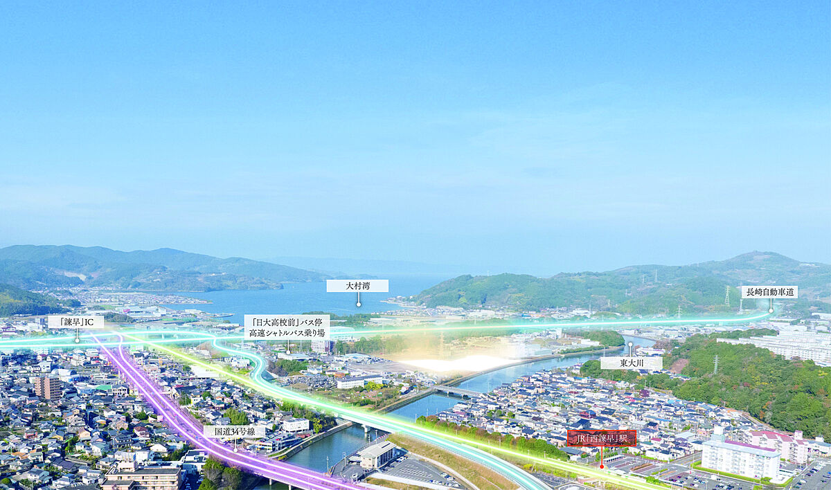 長崎市内への高速シャトルバス停留所も近隣にありJR長崎本線「西諫早」駅までは徒歩13分~14分。通勤・通学・お出かけのアクセスも良好です。