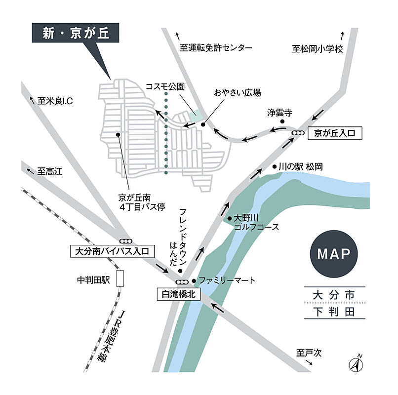 JR日豊本線「大分」駅 バス 48分 京が丘南4丁目 徒歩6分 |