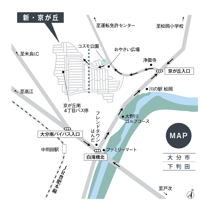 JR日豊本線「大分」駅 バス 48分 京が丘南4丁目 徒歩5分 |