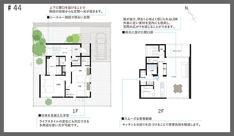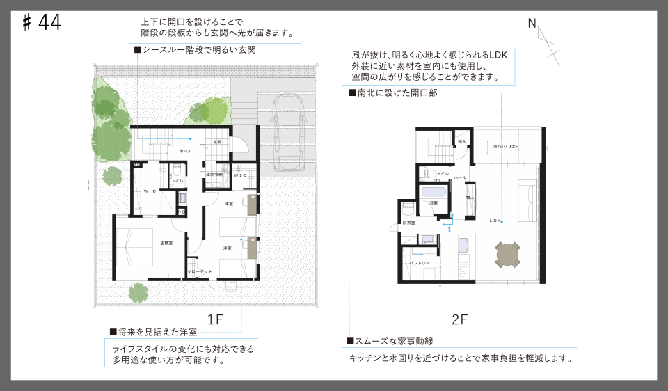 | 完成予定日 | 2024年6月 完成済(44号地)、2026年1月(10号地・63号地) | 引き渡し可能年月 | 即引き渡し可能(44号地)、2026年2月 引き渡し予定(10号地・63号地) |
