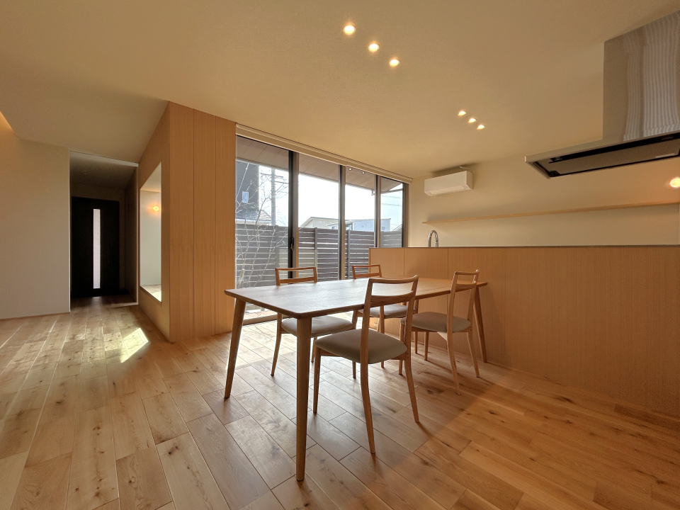 外からの視線に配慮しながら、中庭とウッドデッキに接するLDK。ベンチを設けたリビングのある開放的な住まいです。