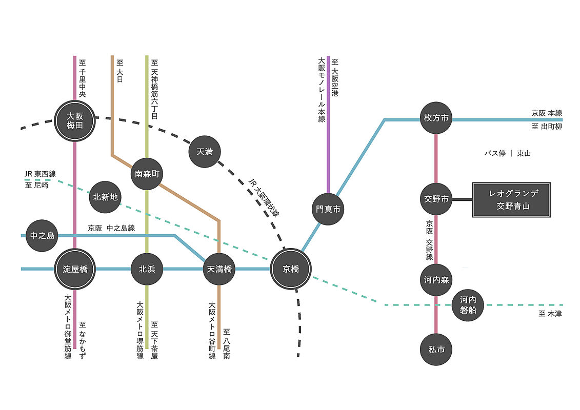 京阪電鉄交野線「交野市」駅まで徒歩20分JR学研都市線「津田」駅まで徒歩20分京阪バス「青山三丁目」停まで徒歩6分
