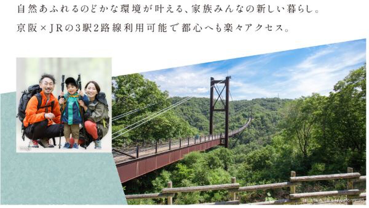 自然あふれるのどかな環境で叶える、家族みんなの新しい暮らし。 京阪×JRの3駅2路線利用可能で都心へも楽々アクセル!