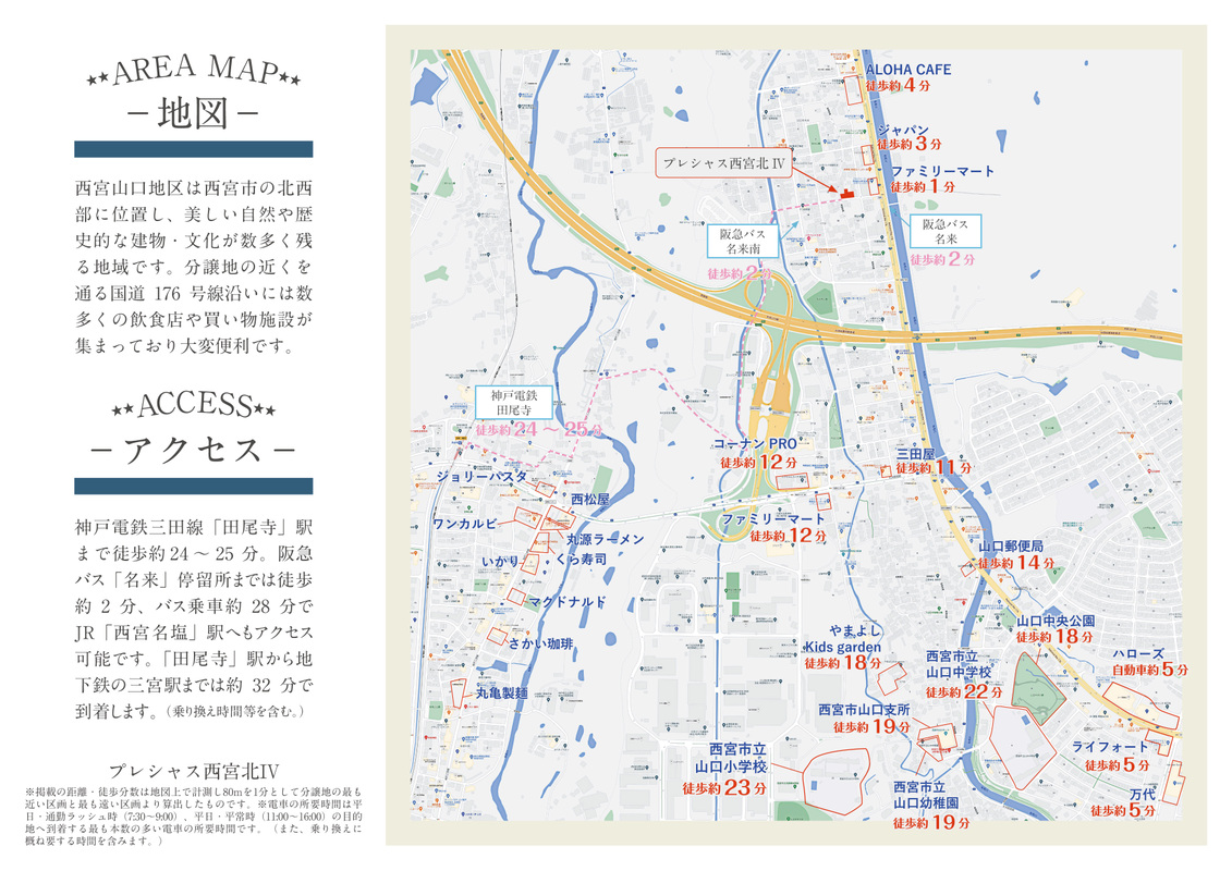 神鉄三田線「田尾寺」駅 徒歩25分 JR福知山線「西宮名塩」駅 阪急バス乗車約28分「名来」停 徒歩2分 神鉄三田線「二郎」駅 徒歩23分 |