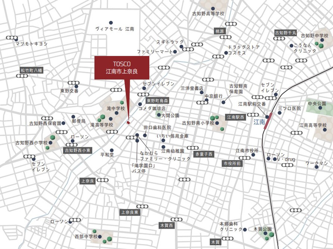 名鉄犬山線「江南」駅 徒歩19分 名鉄犬山線「江南」駅/自転車6分 名鉄バス「滝学園口」バス停 徒歩4分 名鉄犬山線「布袋」駅 車で約3km |
