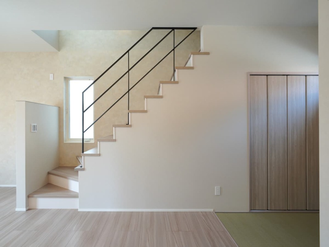 天井高2.7mとアイアン手摺のスタイリッシュなリビング階段で開放感があるLDK
