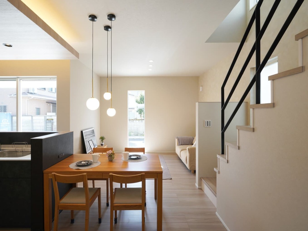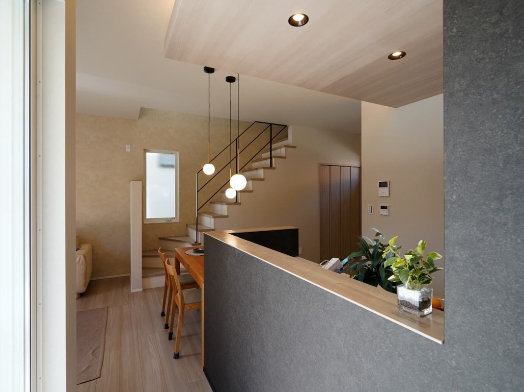 ・玄関からキッチンパントリー、脱衣洗面室へ直接行くことができる回遊動線で、家事がしやすい間取り・約16帖のLDKは天井高2.7mとアイアン手摺のスタイリッシュなリビング階段で開放感がある空間