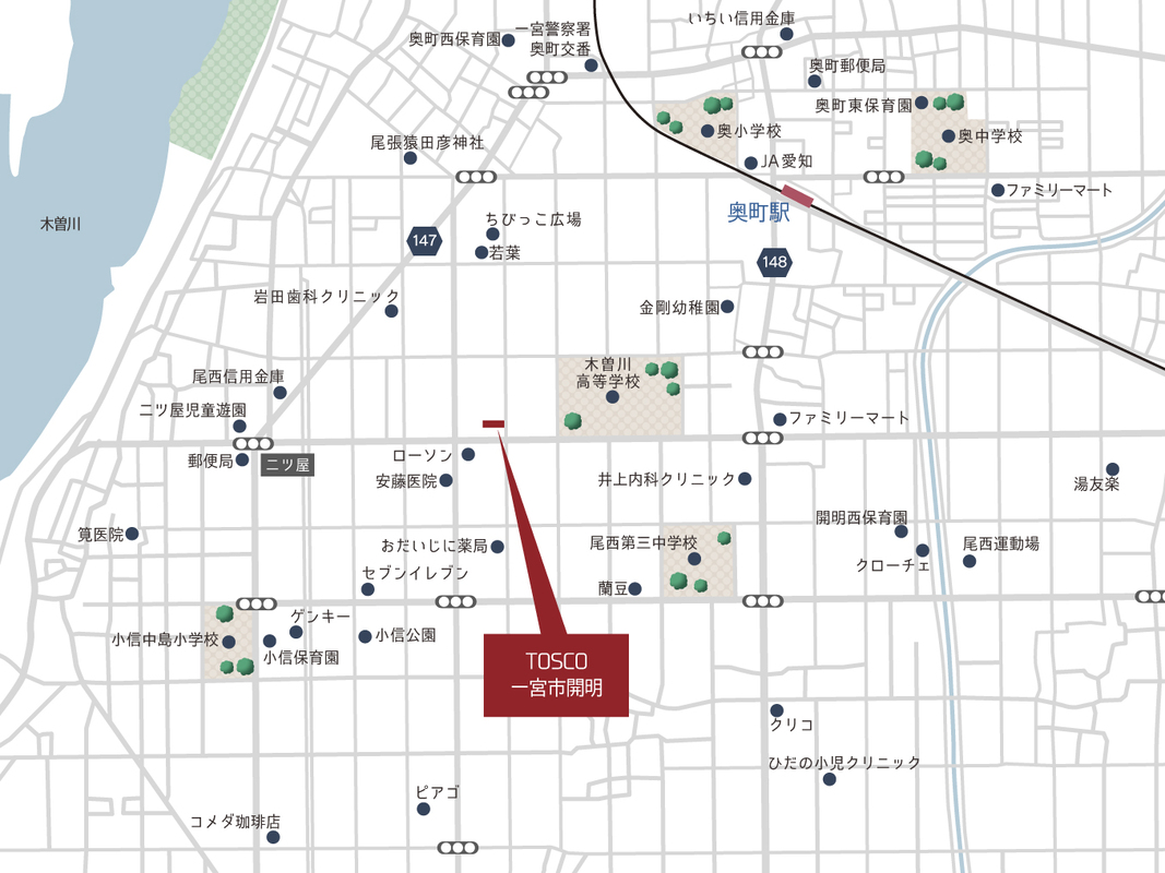 名鉄尾西線「奥町」駅 徒歩11分 自転車 約11分 |