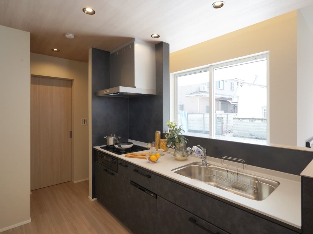 キッチン横には大容量のパントリーがあり、キッチン用品やストックがスッキリ片付きます。玄関と繋がっているので、たくさんお買い物しても運ぶ必要がありません。またキッチンからリビング、階段、外が見えるので、家族とコミュニケーションが取りやすいです。