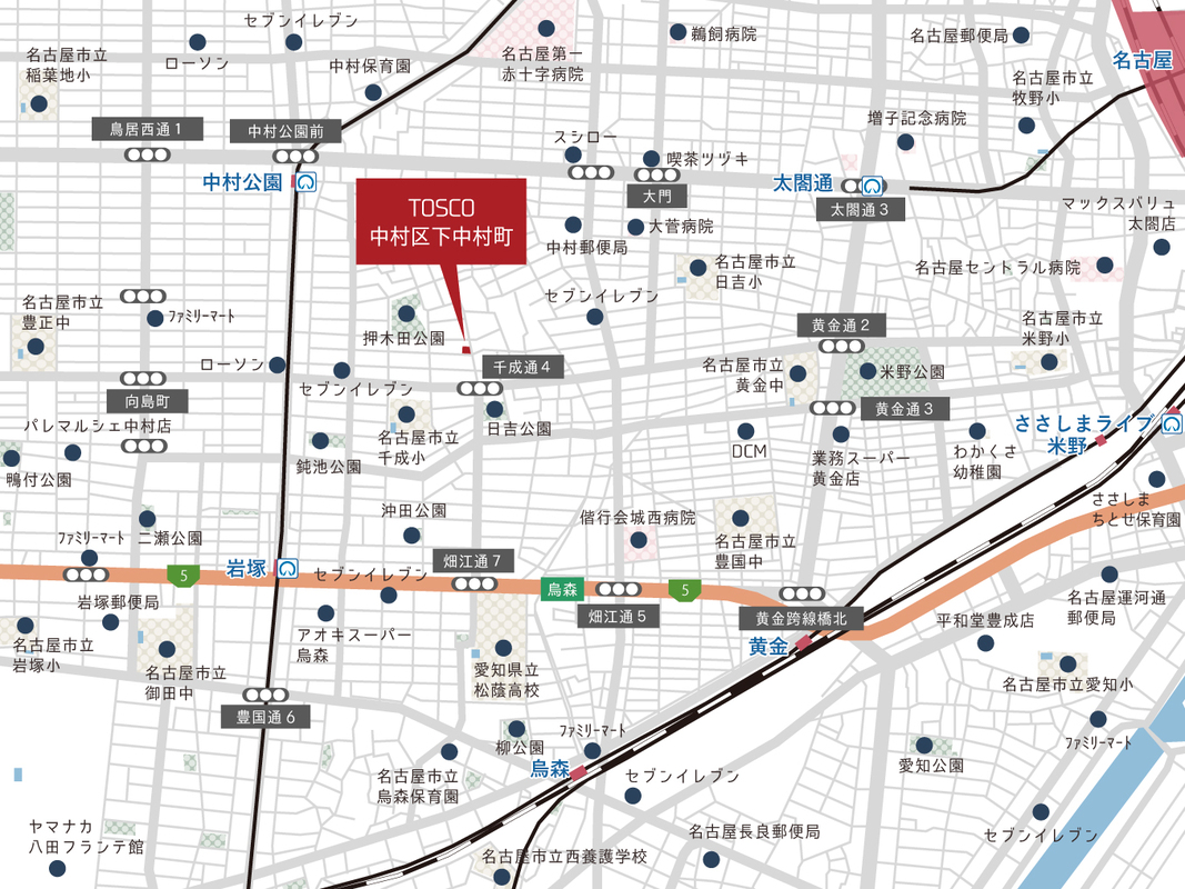 名古屋市営東山線「中村公園」駅 徒歩10分 名古屋市営東山線「岩塚」駅 徒歩15分 千成通四丁目 徒歩2分 |