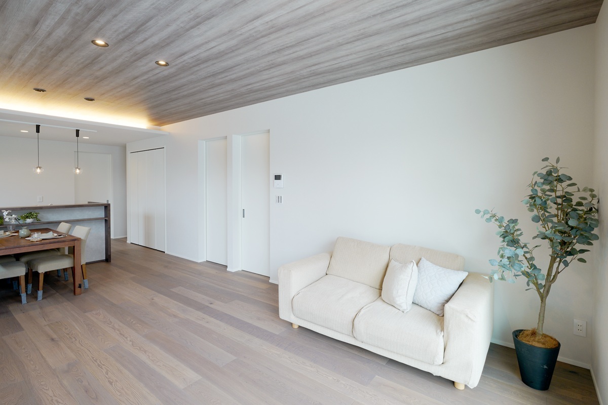 グレージュ系のリビングは落ち着きと上品さを兼ね備え、どんなインテリアとも調和。