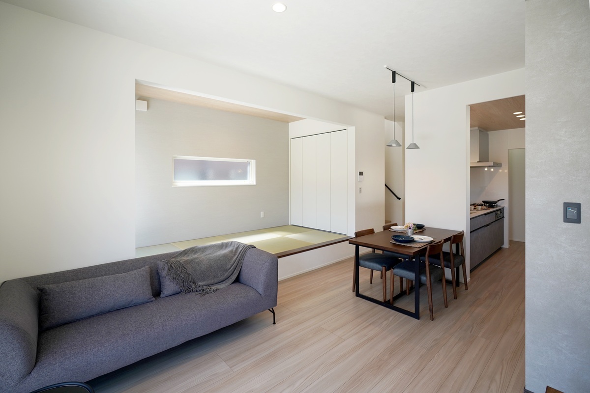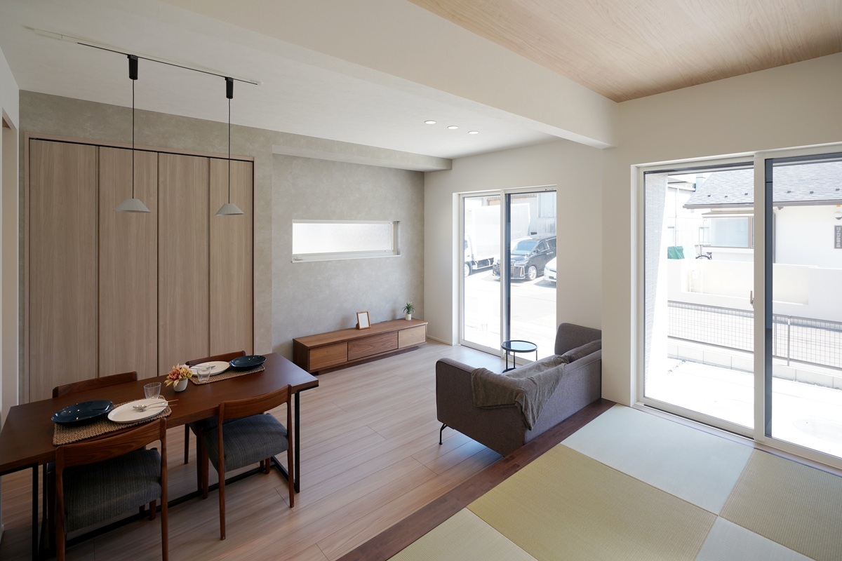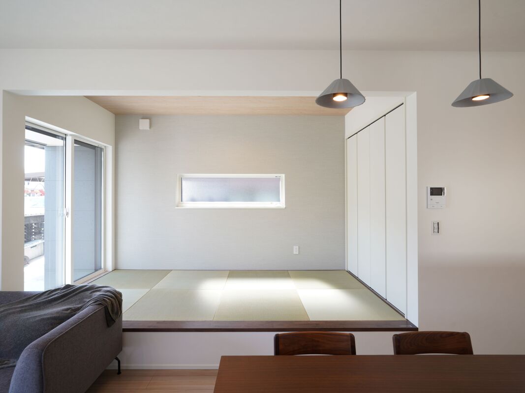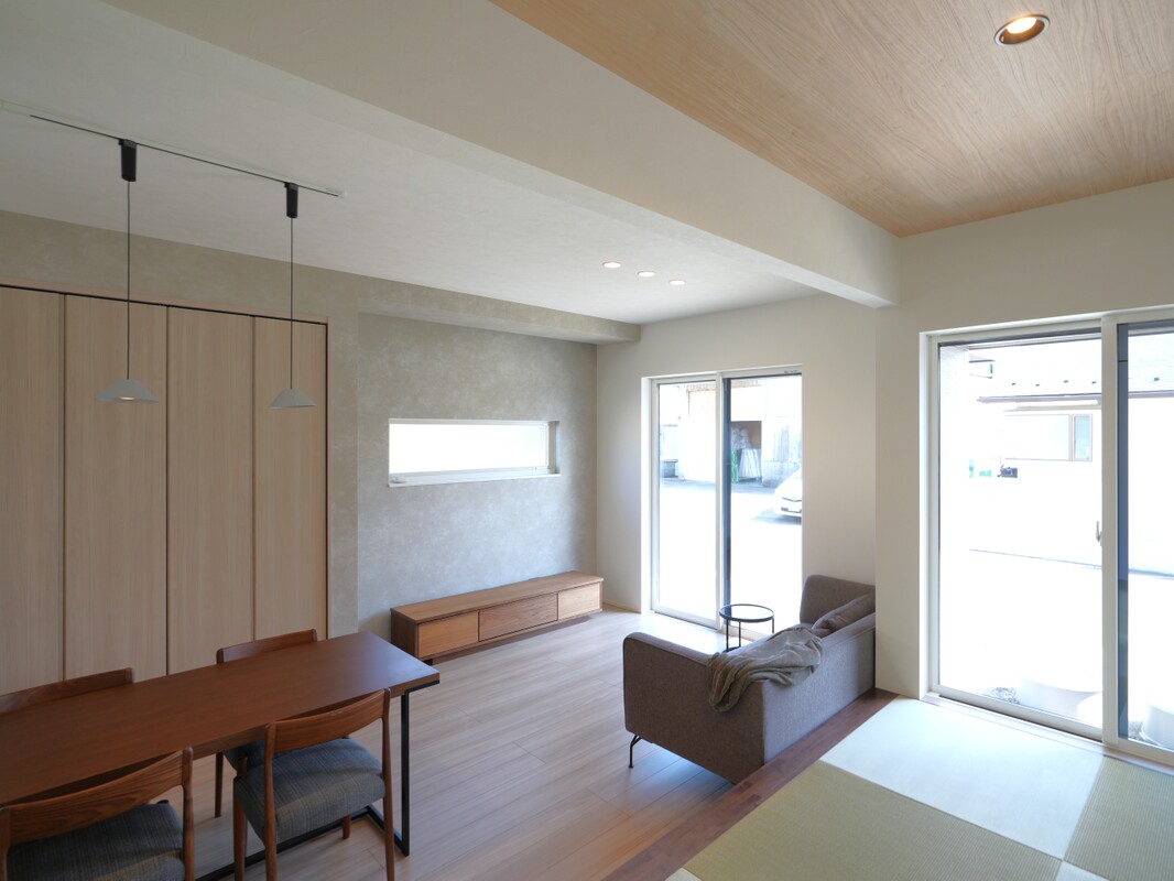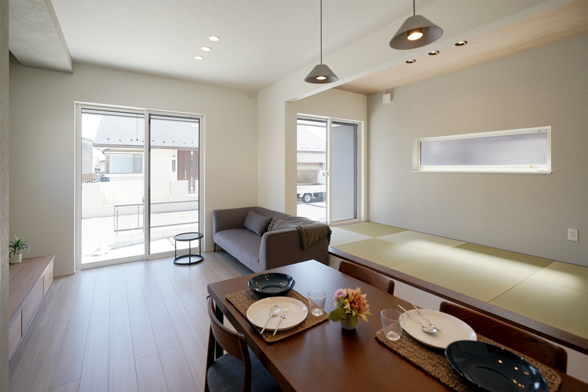 南に面した窓からリビング、畳コーナーに光を採り入れます。日中は照明を消していても明るい室内空間に。