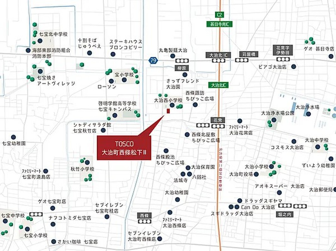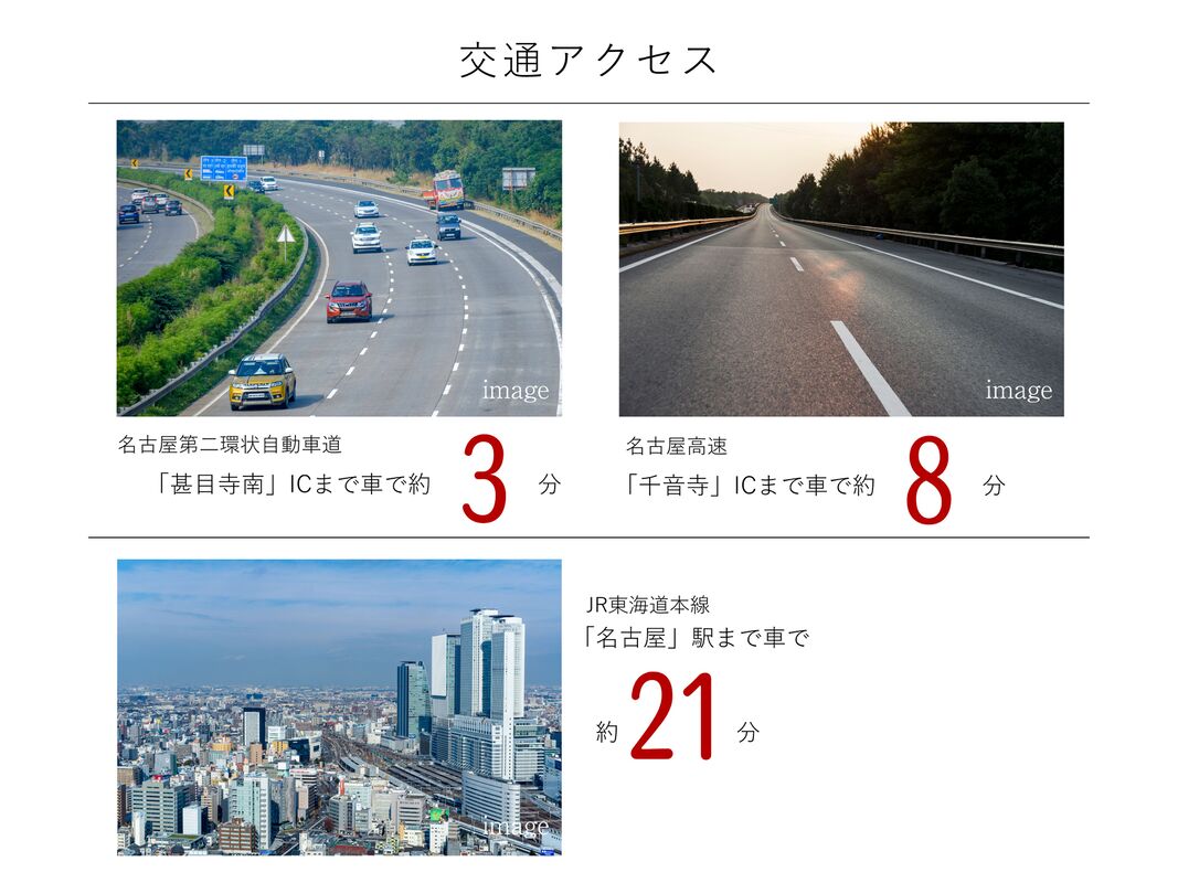名鉄津島線「七宝」駅 徒歩27分 名鉄バス「西条」バス停 徒歩14分 自転車 約5分 名古屋市営東山線「中村公園」駅 名鉄バス「西条」バス停乗車 15分 |