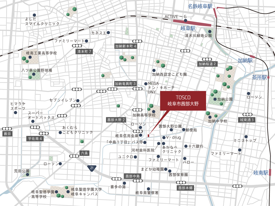 JR東海道本線「岐阜」駅 約1.9km 名鉄名古屋本線「岐南」駅 約2km 岐阜市コミュニティバス「中島一丁目」 徒歩2分 |
