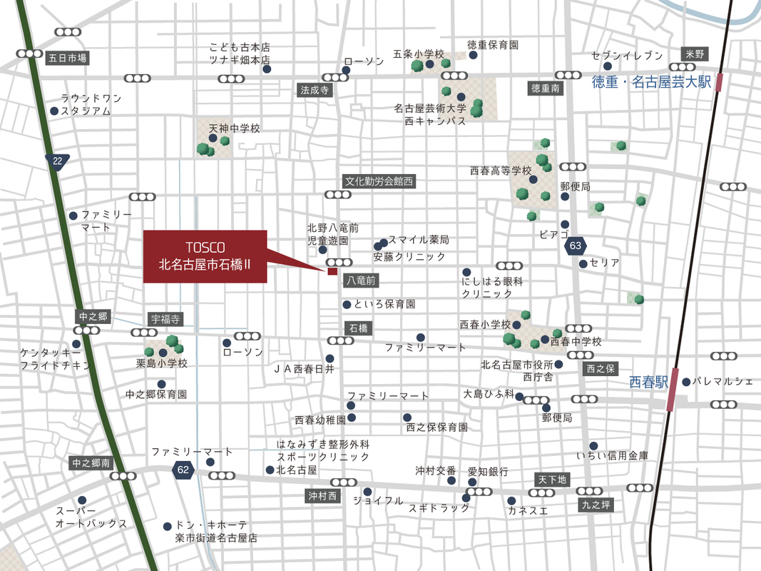 名鉄犬山線「西春」駅 徒歩25分 JR東海道本線「稲沢」駅 徒歩48分 |