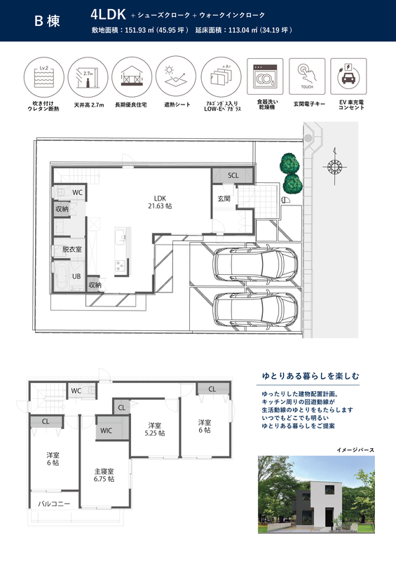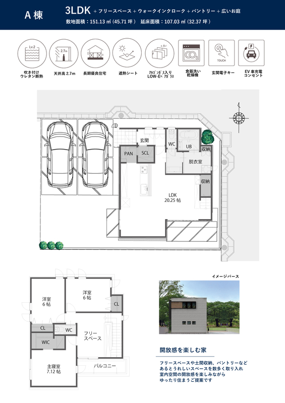 | 建物面積 | A棟:107.03m2・B棟:113.04m2 | 土地面積 | 151.13m2(A棟)・151.93m2(B棟) |