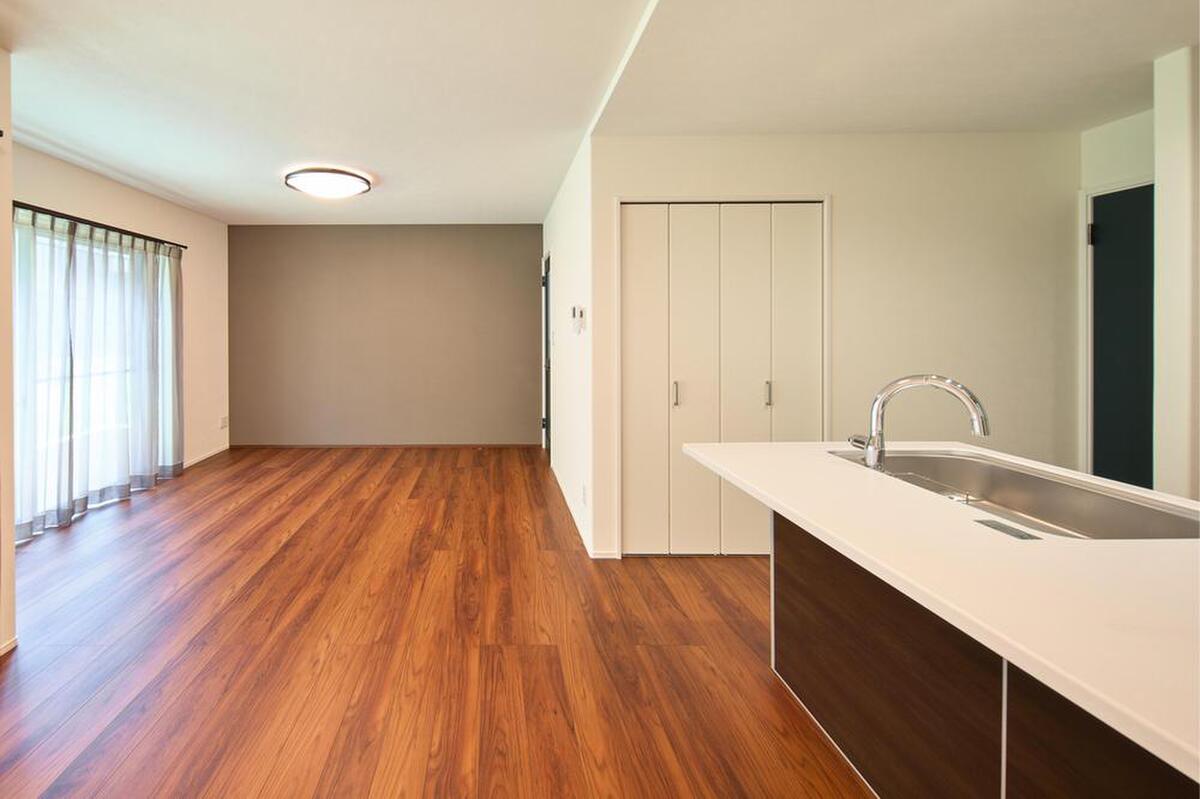 19帖超のゆったりとした広さのLDK。キッチン・ダイニング上部は、木目のクロスを採用し、視覚的に空間をゾーニングしています。対面式キッチンで、調理中もご家族の会話が弾みます。
