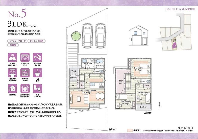| 建物面積 | 101.49m2(約30.7坪)~107.44m2(約32.5坪) | 土地面積 | 128.44m2(約38.85坪)~240.06m2(約72.61坪) |
