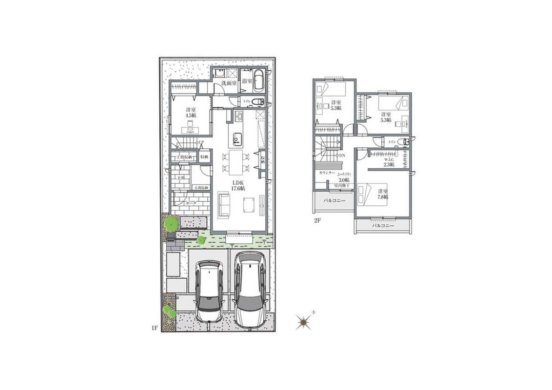 | 建物面積 | 105.8m2・109.32m2(約32.00坪・約33.06坪) | 土地面積 | 121.24m2~138.77m2(36.67坪~41.97坪) |