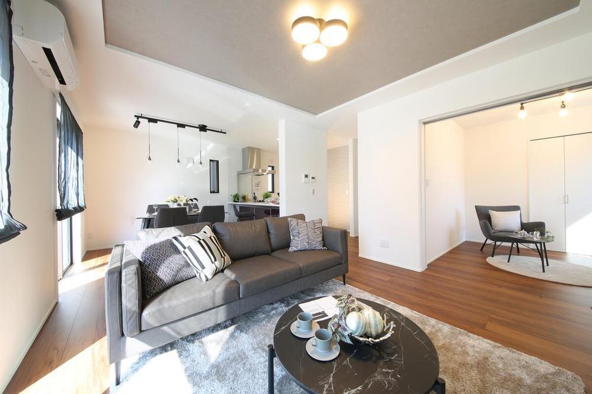 シンプルかつモダンな内装デザインが魅力的なLDK。陽光が降り注ぐ明るい空間です。隣接する洋室は、引き戸を開放し、一体利用も可能◎用途に応じてご活用いただけます。