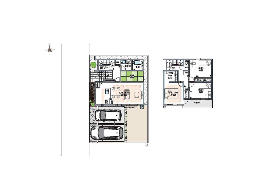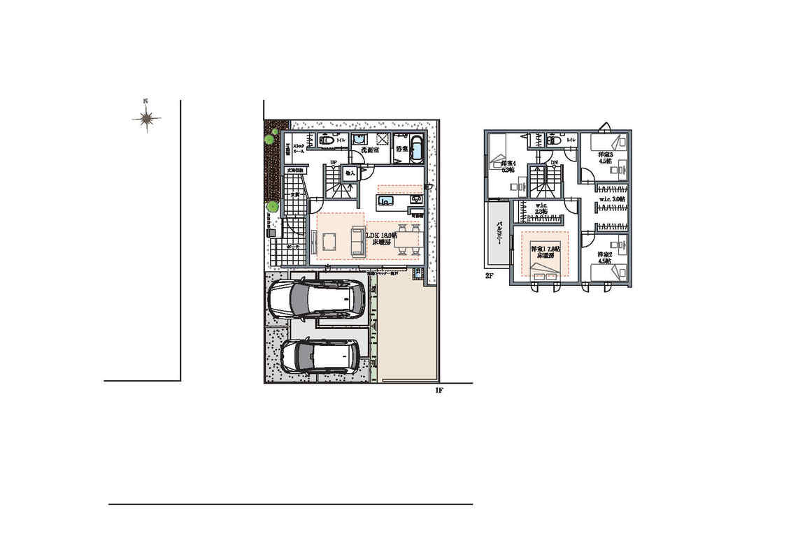 | 建物面積 | 104.35m2・109.73m2(約31.56坪・約33.19坪) | 土地面積 | 127.69m2(約38.62坪) |
