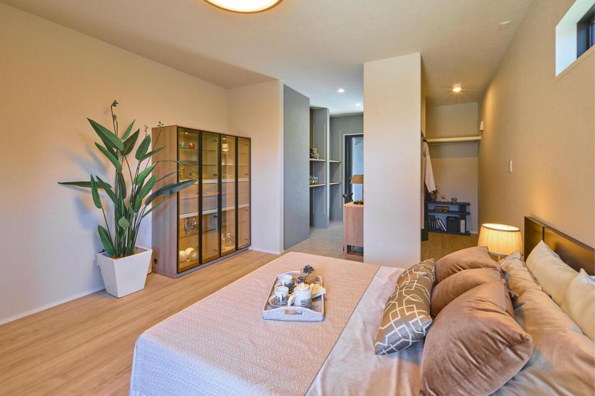 約10.6帖の広々とした洋室。ベッドとサイドテーブルもゆったりと置けるスペースがあります。ウォークインクローゼットが設けてあり、衣類やスーツケースなどの大きい物も収納可能。