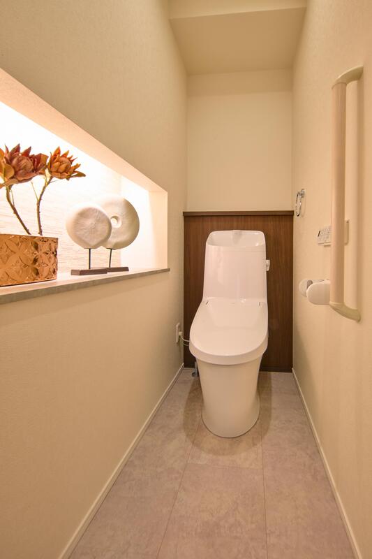 カウンター部分にコーニス照明を施し、モダンな雰囲気を演出。ディフューザーなどを置くこともでき、空間づくりを楽しめます。温水洗浄便座付き、リモコンは壁付けタイプです。