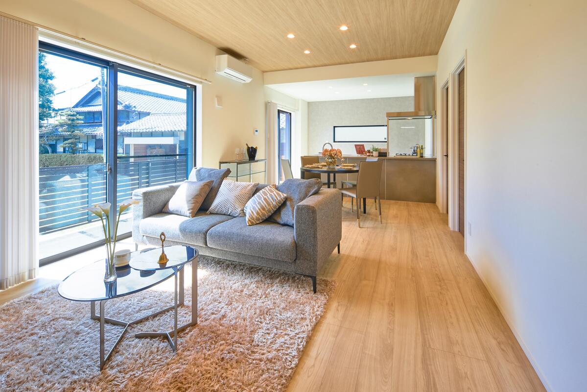 LDKは広々約17.4帖!ゆったりと家族団らんをお楽しみいただけます。庭へ続く掃き出し窓を2か所に設けており、陽光と風が心地よく舞い込みます。