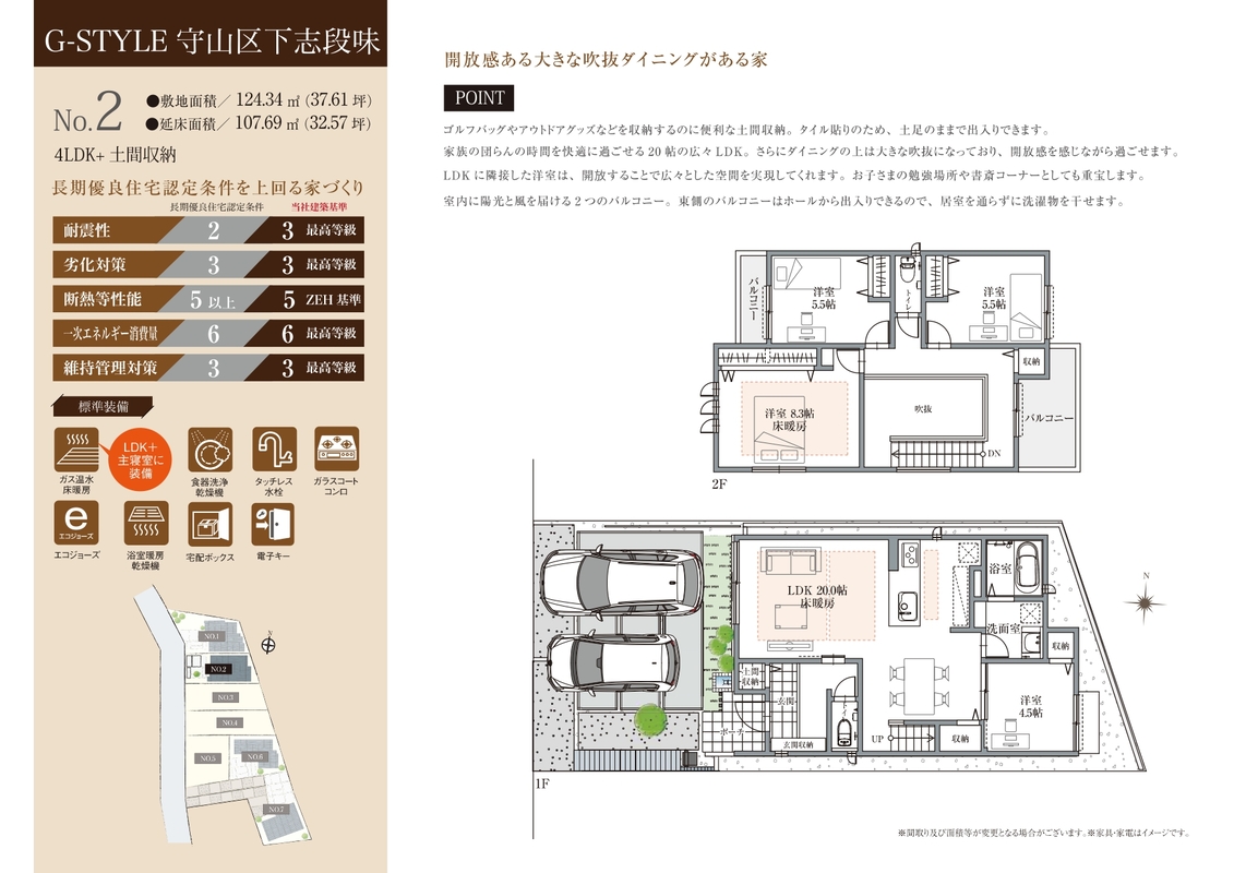 | 建物面積 | 97.82m2~110.72m2(29.59坪~33.49坪)(実測) | 土地面積 | 123.42m2~177.17m2(37.33坪~53.59坪) |
