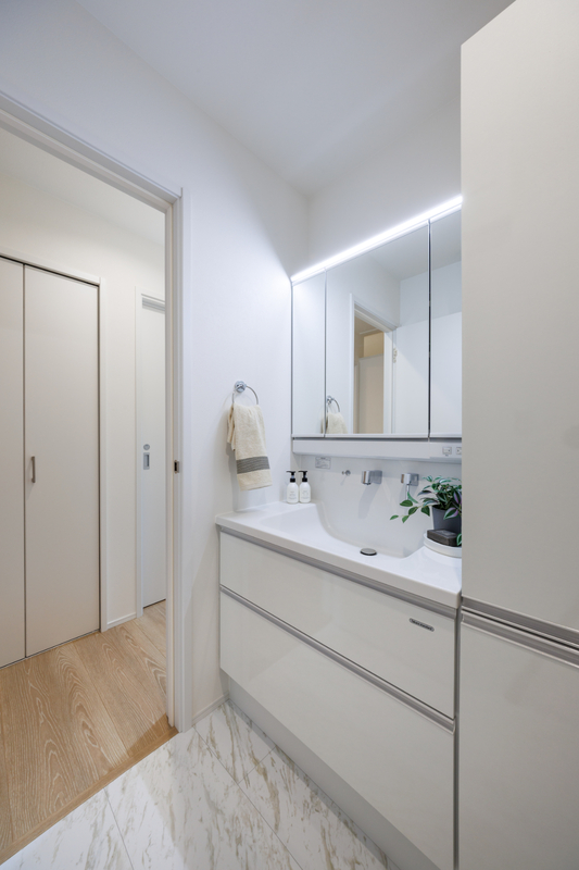 3面鏡付きの洗面台は、上部からの吐水で水栓回りをきれいに保てます。洗面台下部に引き出し収納があり、化粧品や洗面用品などを保管できます。