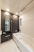 ダークカラーのアクセントパネルが映えるスタイリッシュな浴室。シャンプー類が置ける棚付きで、雨の日や花粉の時期に重宝する浴室乾燥機も備えています。