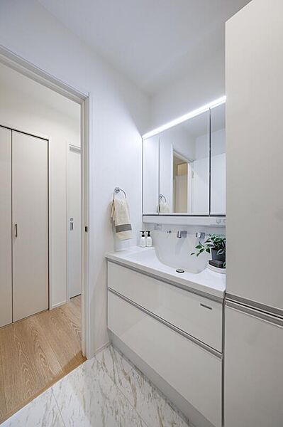 ヘアセットがしやすい三面鏡の洗面化粧台で...