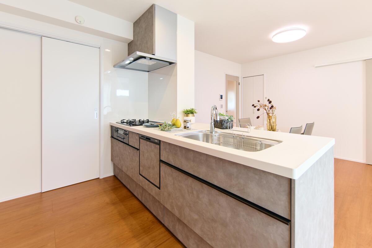 調理中にリビングの様子が見守れる、対面式キッチン。家事負担軽減に役立つ、食器洗乾燥機を搭載。シンク下の収納はスライド式なので、奥にしまった鍋類などが取り出しやすい仕様です。