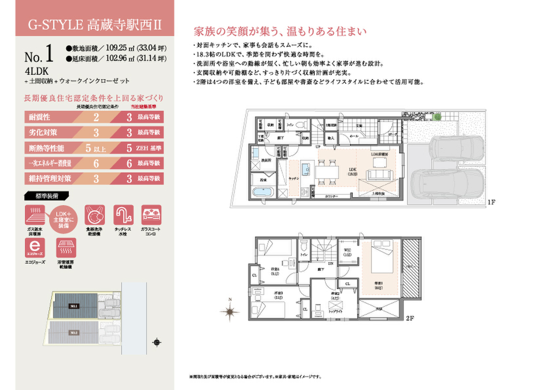 | 建物面積 | 102.96m2・104.27m2(約31.14坪・約31.54坪) | 土地面積 | 108.74m2・109.25m2(約32.89坪・約33.04坪) |