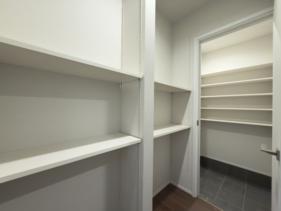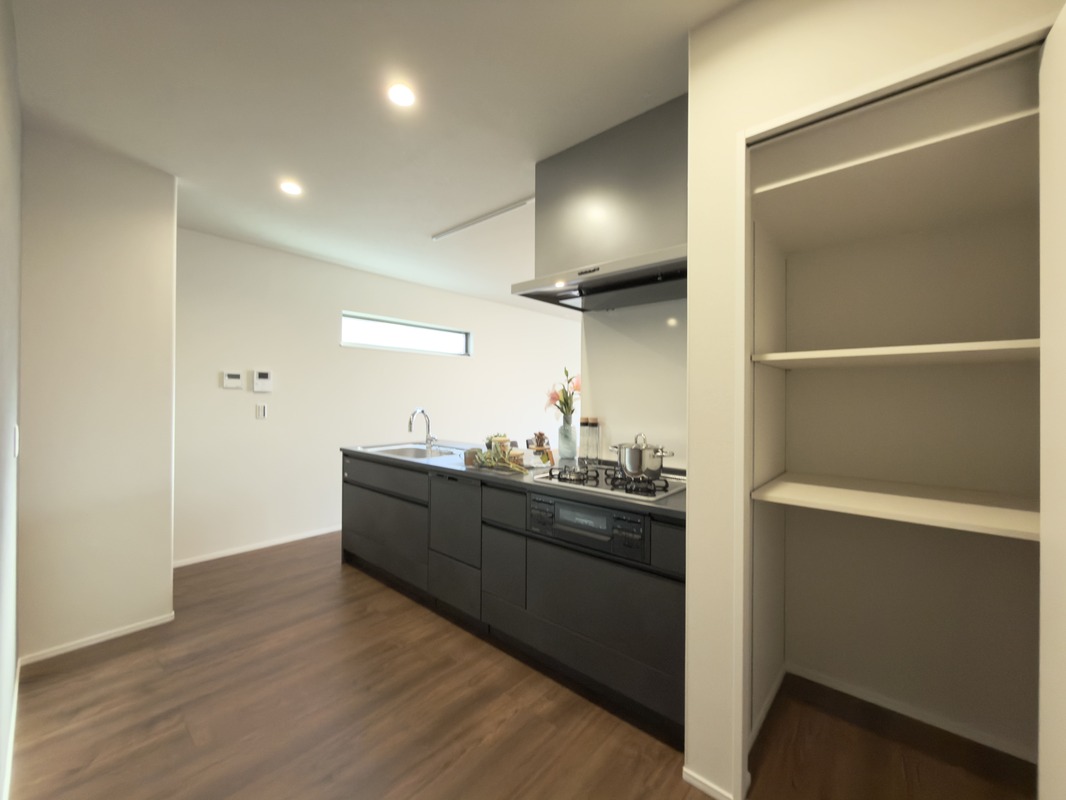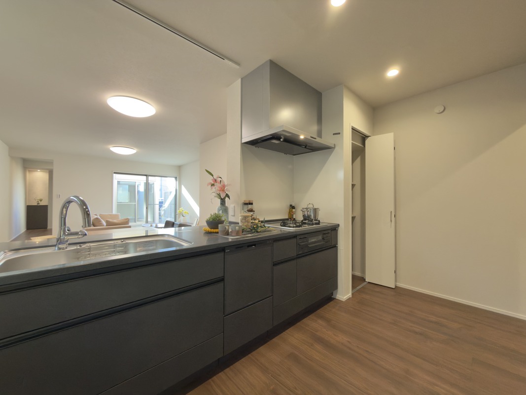 食器洗浄乾燥機やタッチレス水栓、ガラスコートコンロを備えた、機能的なキッチンです。パントリー付きで、食器や食品ストック、調理グッズなどをたっぷりと収納できます。