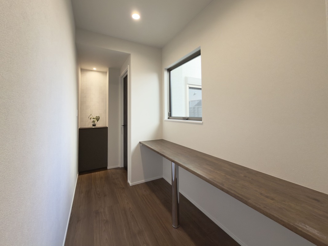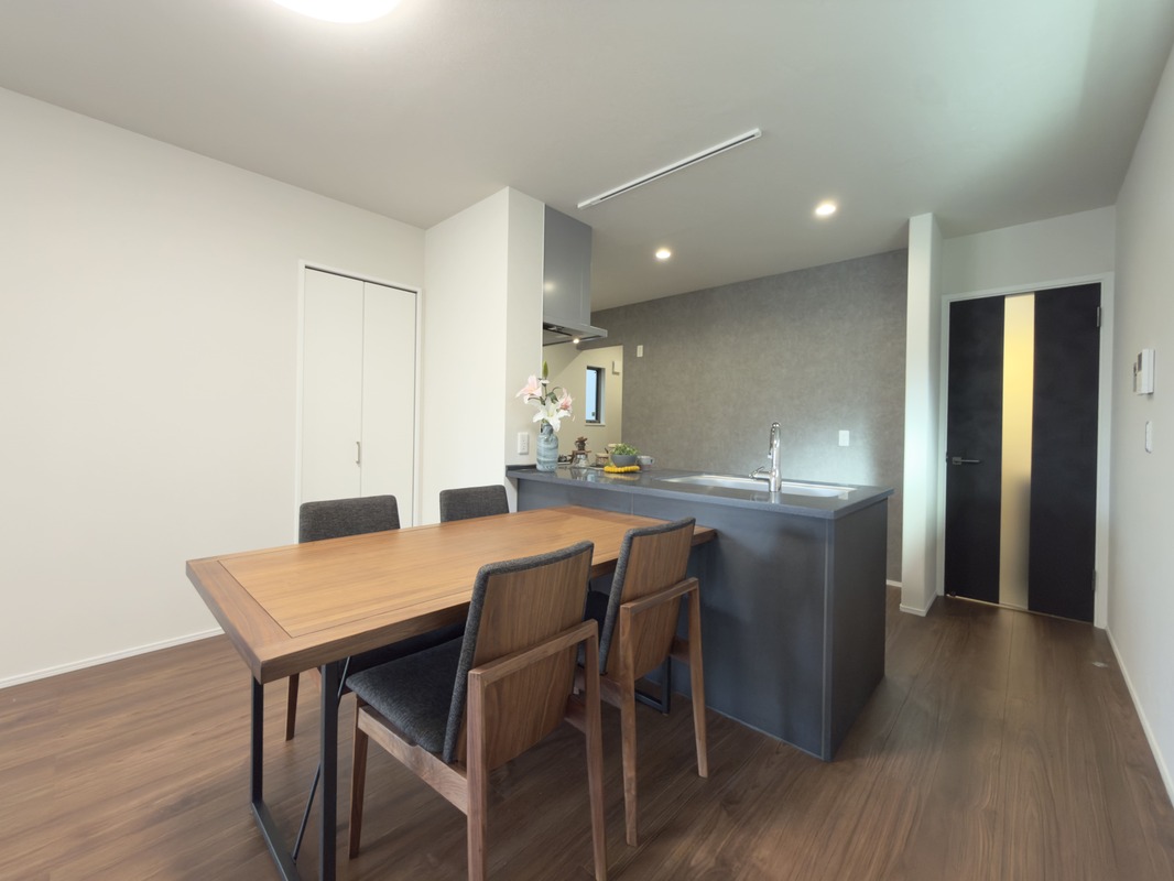 LDKは約23.8帖!一角にカウンター付きのライブラリーを設けました。玄関~土間収納~ストックコーナーを抜けてキッチンにアクセスでき買い物の運び込みがスムーズです。