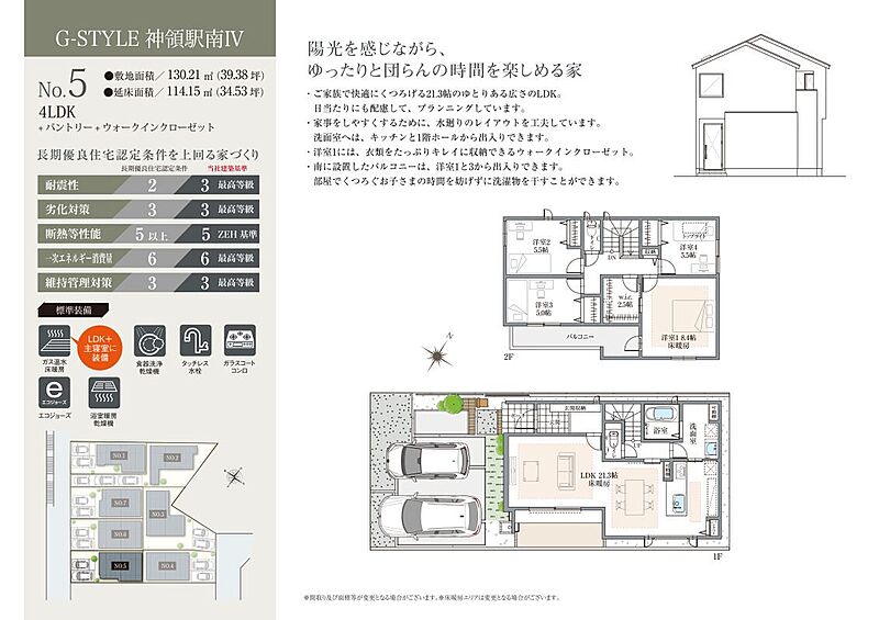 | 建物面積 | 101.03m2・114.15m2(約30.56坪~約34.53坪) | 土地面積 | 130.21m2・130.26m2(約39.38坪~約39.40坪) |