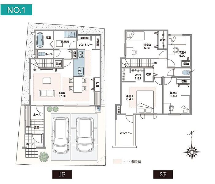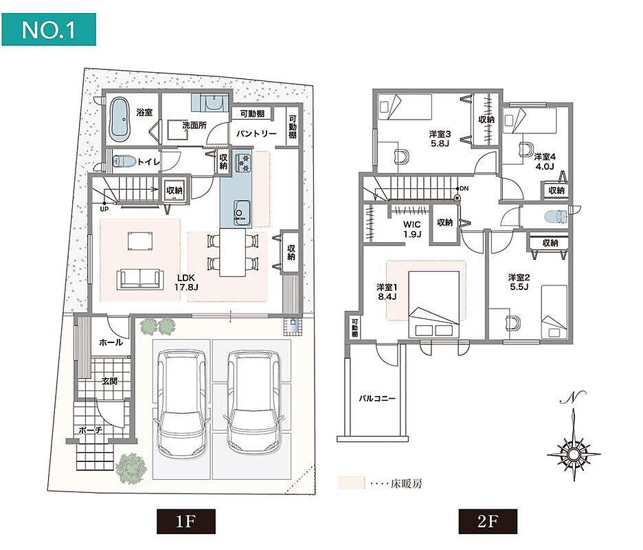 暮らしのメイン空間LDKはゆったり17帖超!パントリーやリビング収納、WIC、各階ホール収納など、随所に収納を備えたレイアウトです。キッチン~パントリー~洗面所へ繋がる、スムーズな家事動線です。車2台、並列駐車可(車種による)。