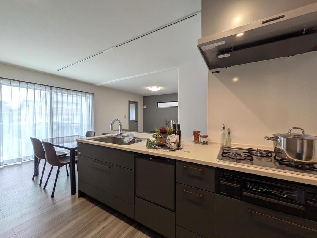 食器洗浄乾燥機を搭載したシステムキッチンです。洗い物の時間が短縮でき、ご家族と過ごす時間を増やすことができます。3口ガスコンロ付き。