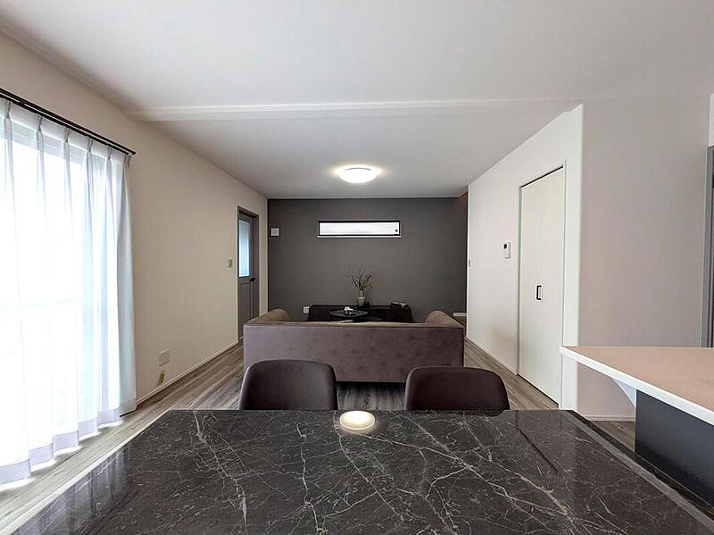 ・LDKは約17.8帖×一角にカウンター付き。リビング階段を採用