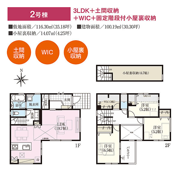 ■固定階段式小屋裏収納やWIC、土間収納など随所に収納スペースあり。