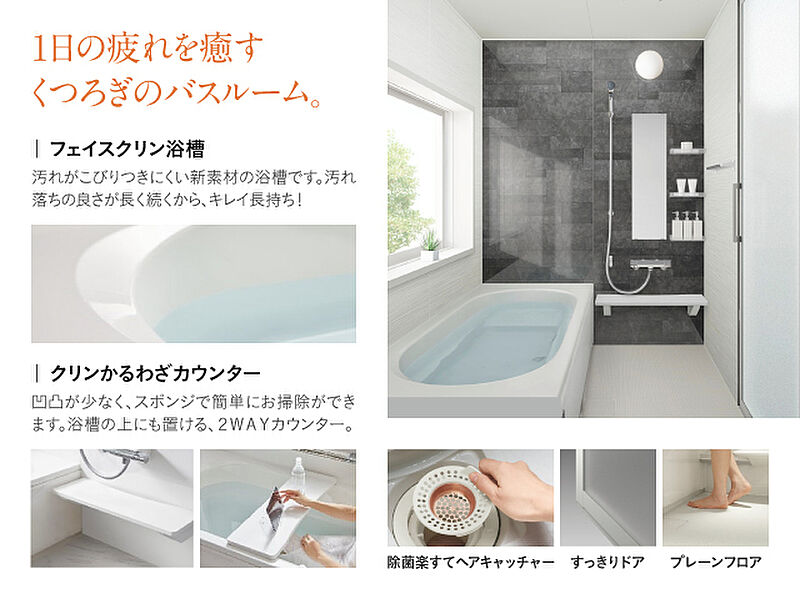 一日の疲れを癒やす大切な空間。汚れがこびりつきにくい新素材の「フェイスクリン浴槽」、イヤな排水口のヌメリをガードする「除菌楽すてヘアキャッチャー」等、お手入れを楽にする様々な機能性を備えたバスルーム。