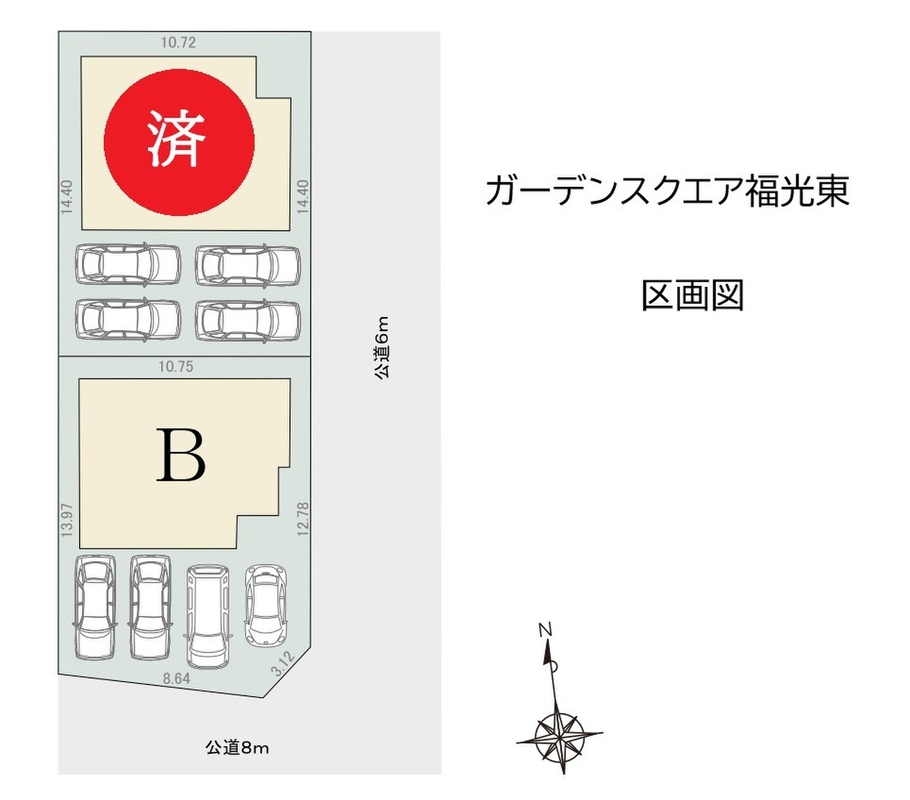 | 駐車場 | 4台 | 道路の幅員 | 南側8m・東側6m |