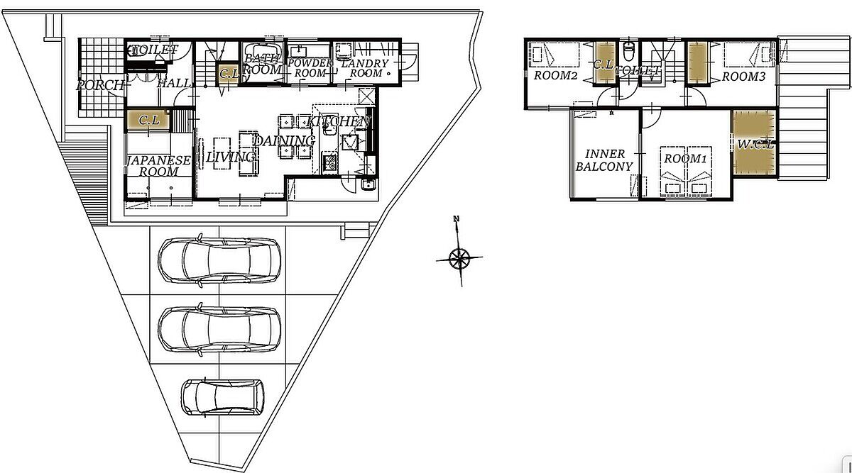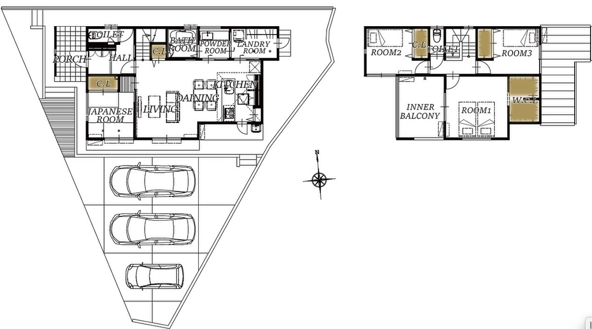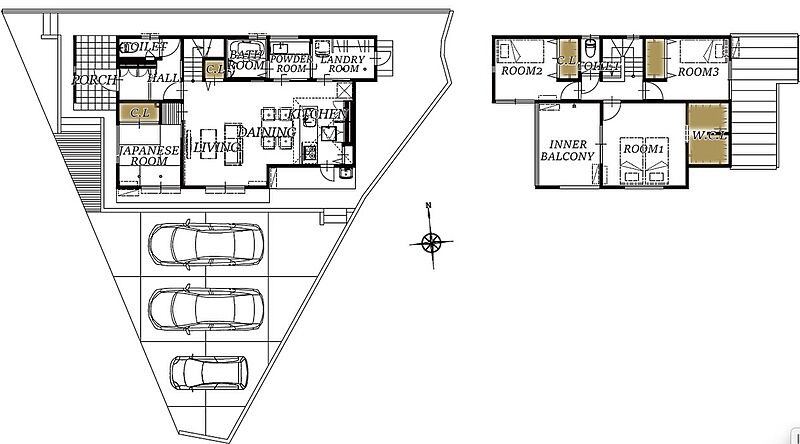 広さ60坪、敷地の形状を上手く活用し駐車並列3台以上を確保。