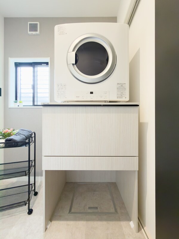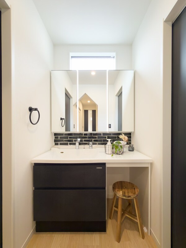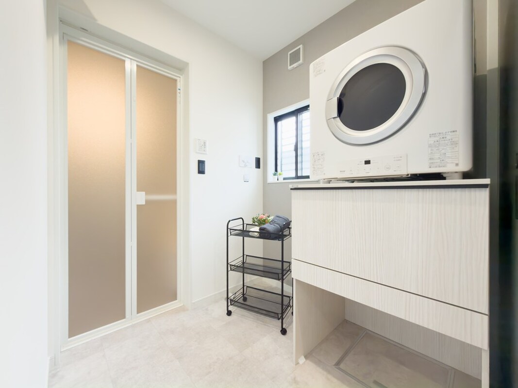 玄関と洗面をつなぐ多機能土間ランドリールーム。物干し金物を2台設け、たっぷり収納も確保。シューズクロークとしても使えるマルチスペース。脱衣室にはガス衣類乾燥機「幹太くん」付で家事効率アップ。