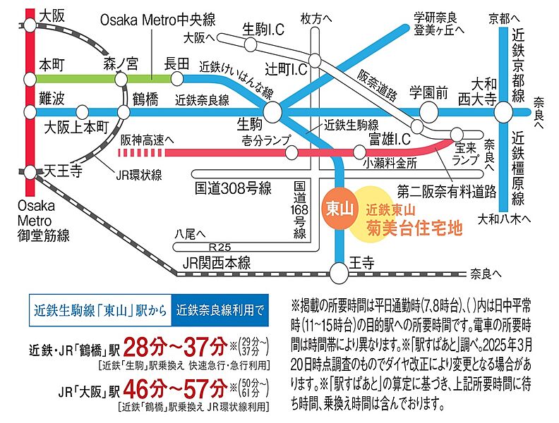 ■「東山」駅より、百貨店が揃う「生駒」駅へ11分。近鉄「大阪難波」駅20分、近鉄・JR「鶴橋」駅28分、Osaka Metro「本町」駅40分、JR「天王寺」駅も40分と、都心主要エリアへ快適アクセス